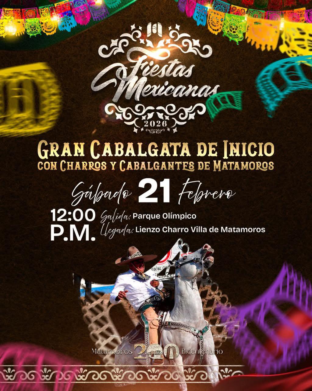 H. Matamoros, Tamaulipas.- En el marco de las Fiestas Mexicanas 2026, el Gobierno Municipal que encabeza Beto Granados hace una cordial invitación a la ciudadanía para participar en la Gran Cabalgata de Inicio, un evento que reunirá a charros y cabalgantes de Matamoros en una celebración que honra nuestras raíces, identidad y orgullo mexicano.