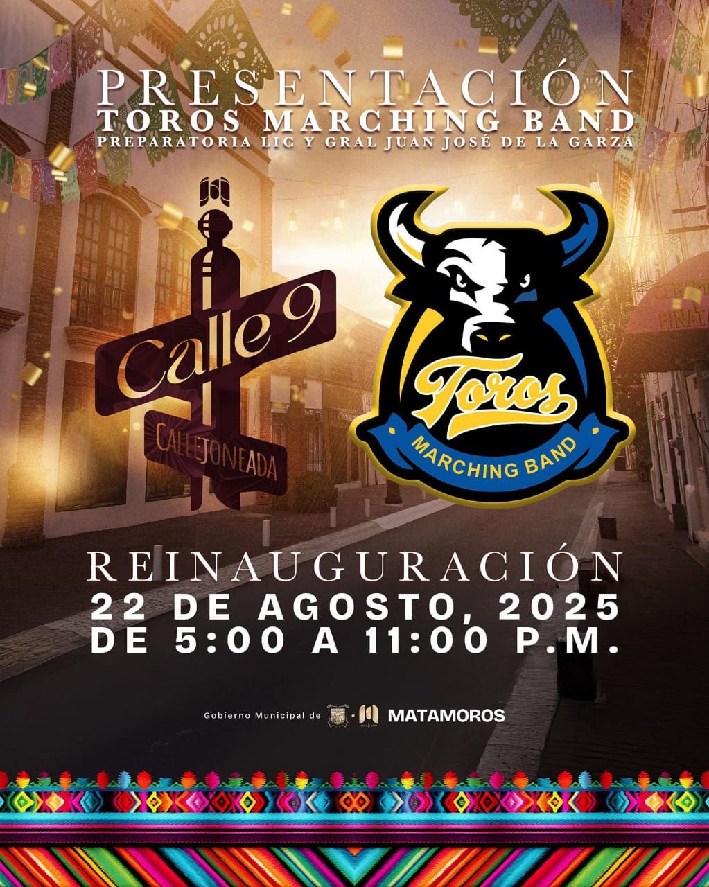 H. Matamoros, Tamaulipas.- El gobierno de Beto Granados te invita a vivir una noche llena de música, alegría y tradición con la espectacular presentación de Toros Marching Band, como parte de la reinauguración de la Callejoneada en la emblemática Calle 9. El evento se llevará a cabo este viernes 22 de agosto de 2025, de 5:00 p.m. a 11:00 p.m., con un ambiente familiar y lleno de talento local.