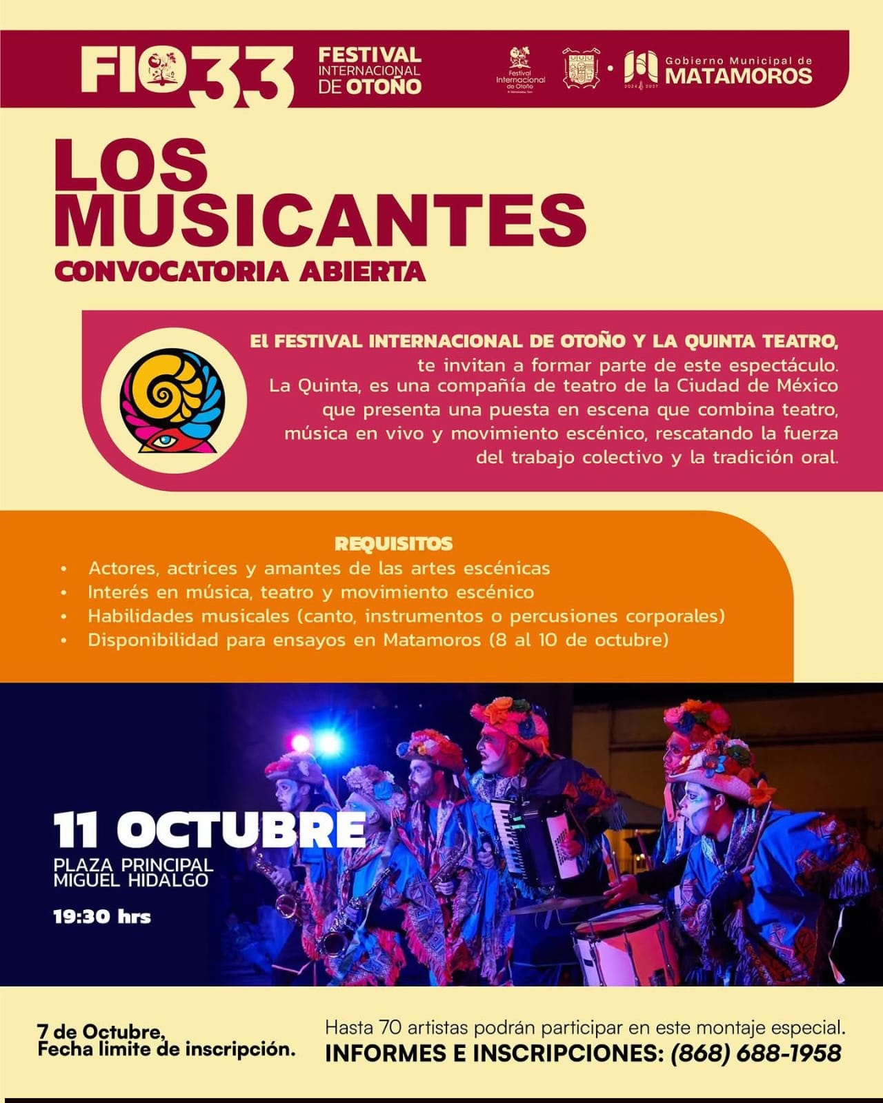 H. Matamoros, Tamaulipas.- El gobierno municipal que encabeza Beto Granados lanzó una invitación abierta a la comunidad artística y al público en general para participar en la convocatoria del espectáculo Los Musicantes, una propuesta escénica que será presentada como parte del Festival Internacional de Otoño (FIO33). Esta iniciativa busca reunir a actores, actrices y amantes de las artes escénicas en un montaje que fusiona teatro, música en vivo y movimiento escénico.