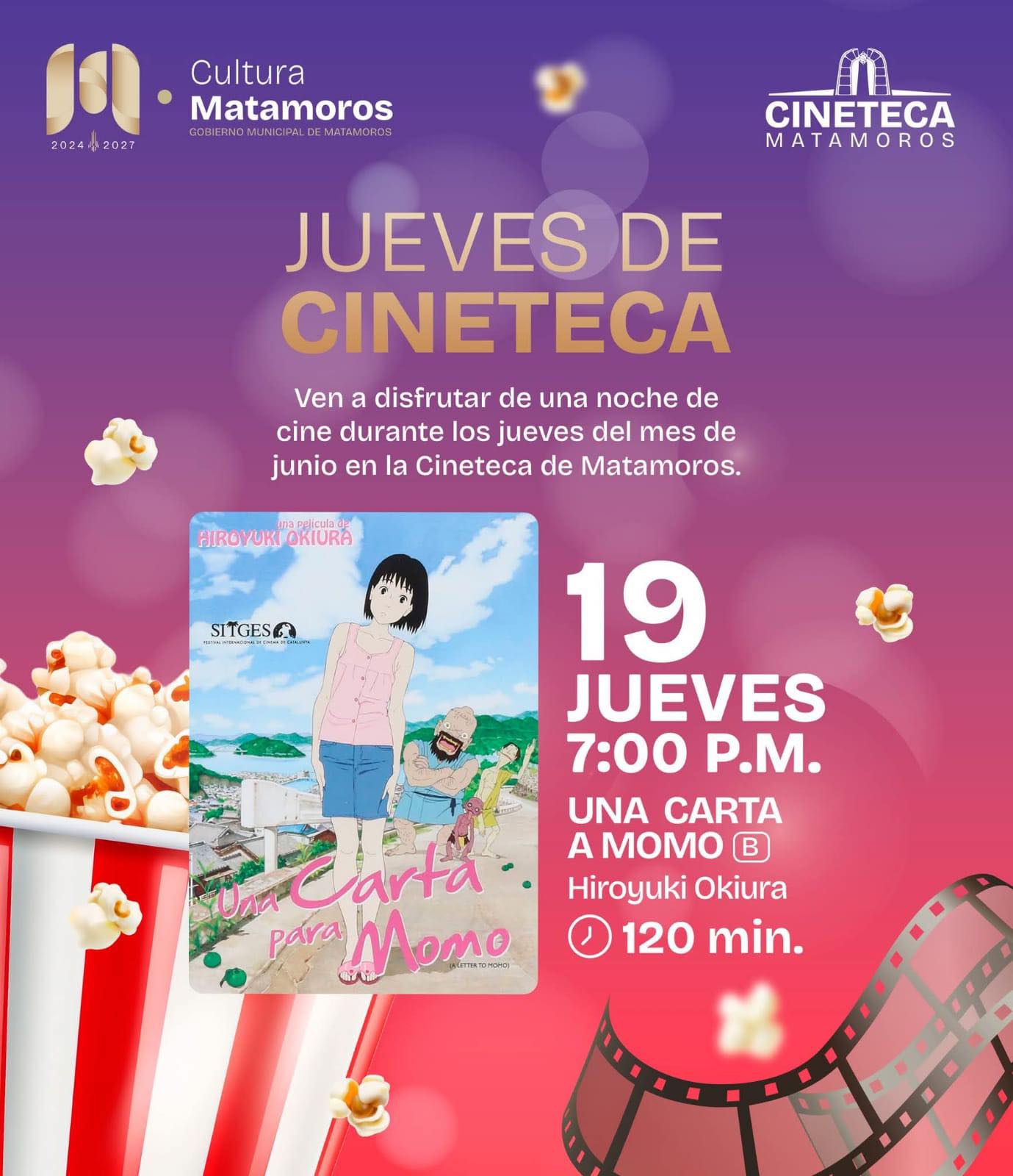 H. Matamoros, Tamaulipas.- El Gobierno de Matamoros, que preside Beto Granados, invita a la comunidad a disfrutar de la película de animación japonesa «Una carta a Momo», dirigida por Hiroyuki Okiura. La proyección tendrá lugar mañana jueves 19 de junio a las 19:00 horas en la Cineteca Matamoros.