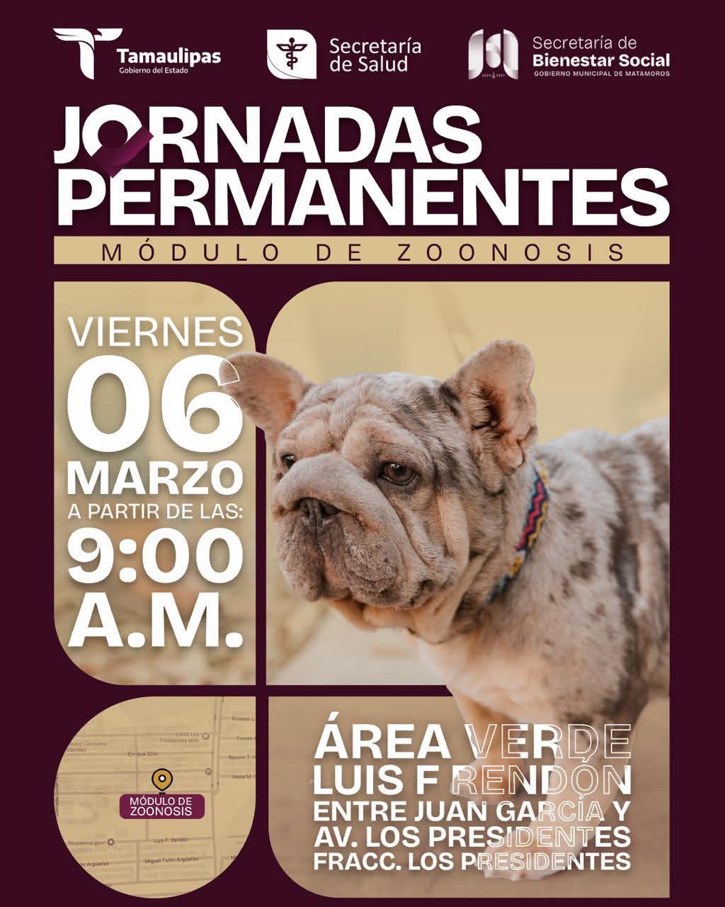 Este viernes, la Jornada Permanente del Módulo de Zoonosis se llevará a cabo en el área verde Luis F. Rendón, del Fraccionamiento Los Presidentes, ofreciendo atención enfocada en la salud y bienestar de perros y gatos.