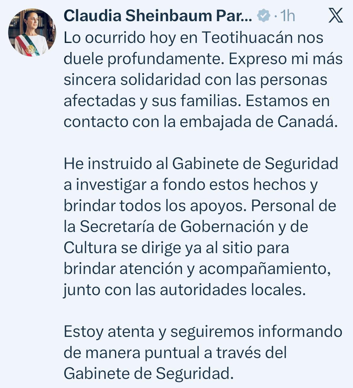 La presidenta de México Claudia Sheinbaum expresó su pesar por lo ocurrido en la zona arqueológica de Teotihuacán