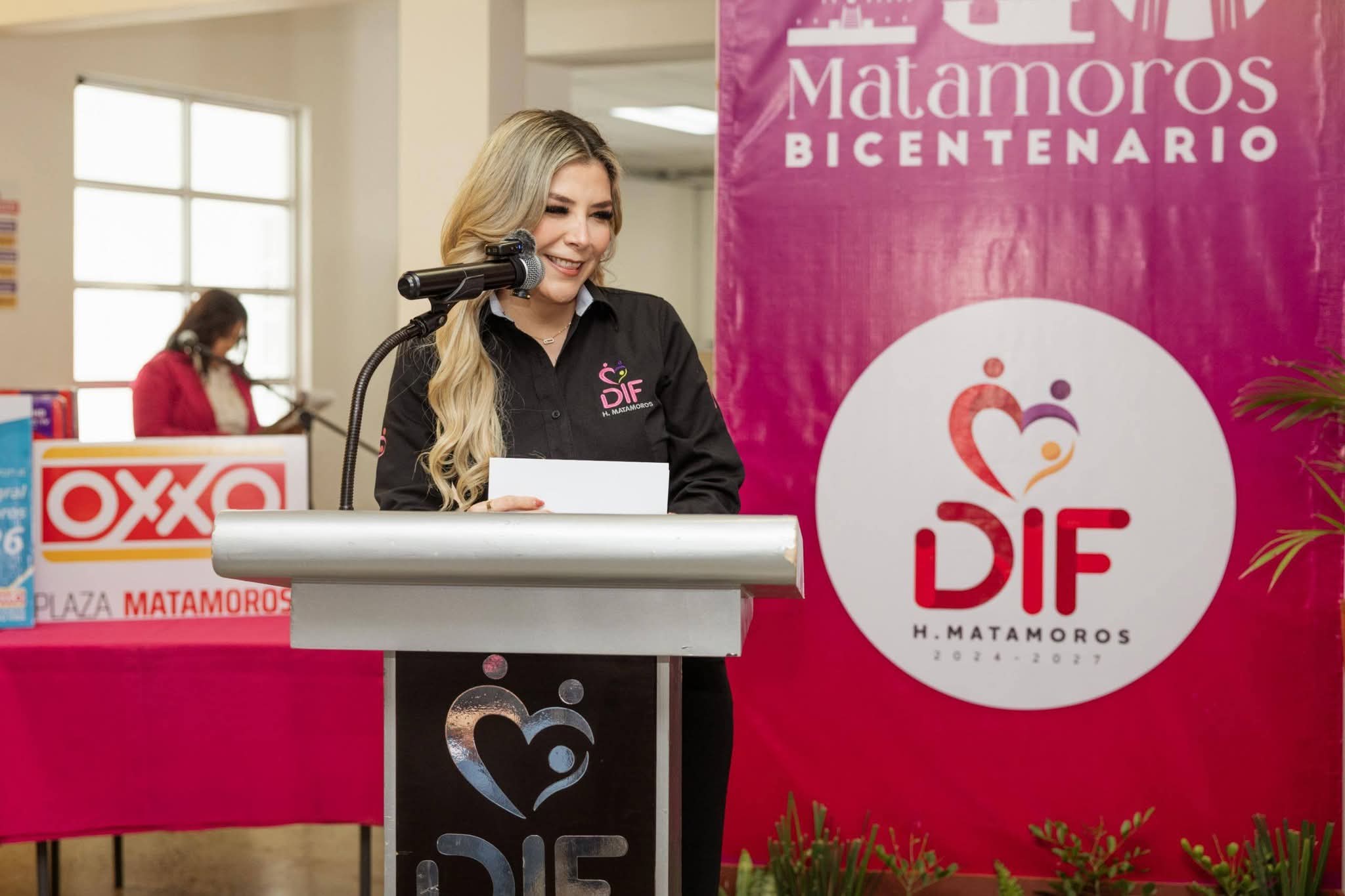 Como parte de la bienvenida a las autoridades, la Directora General de DIF Matamoros, Dra. María Elena Sánchez Cantú, agradeció a la Lic. Karina Iveth Gutiérrez Aguirre, Gerente de la Plaza OXXO en Matamoros, por esta noble labor que une a la comunidad en un acto de solidaridad. También mencionó que gracias al apoyo de los clientes de esta empresa, la cifra total del donativo durante el trimestre de octubre a diciembre, fue de $705 mil 592 pesos con 26 centavos, mismos que fortalecerán los programas sociales de este organismo.